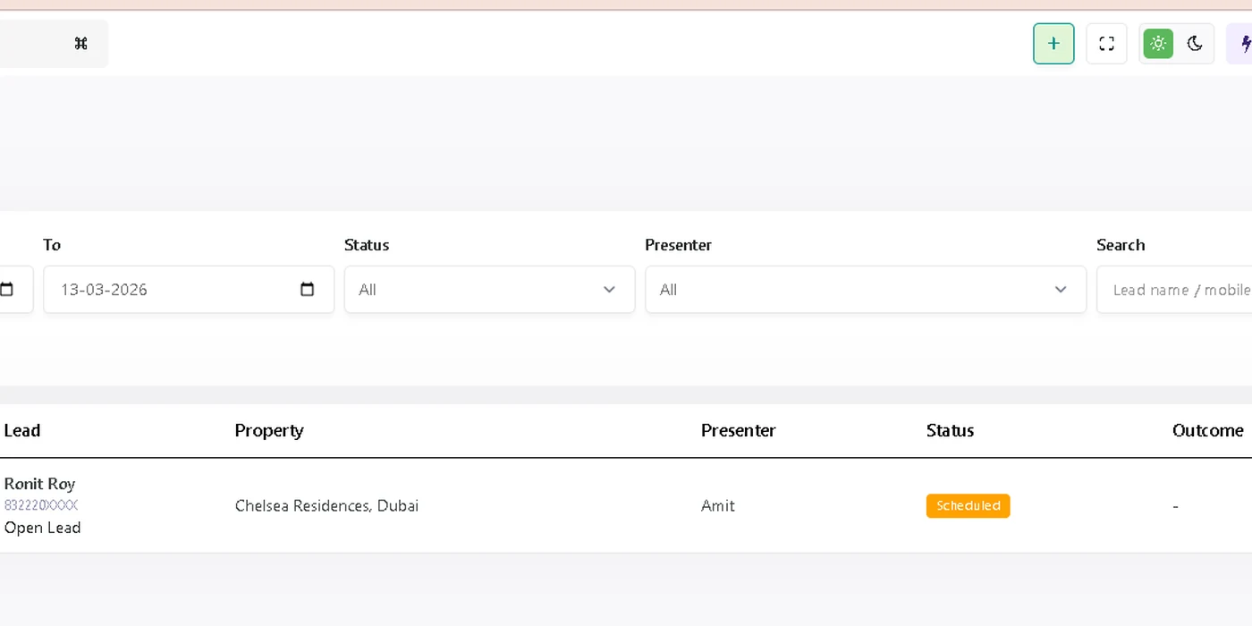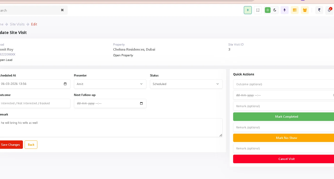 Explore actual product screens for lead handling, follow-ups, site visits, inventory mapping and internal collaboration.