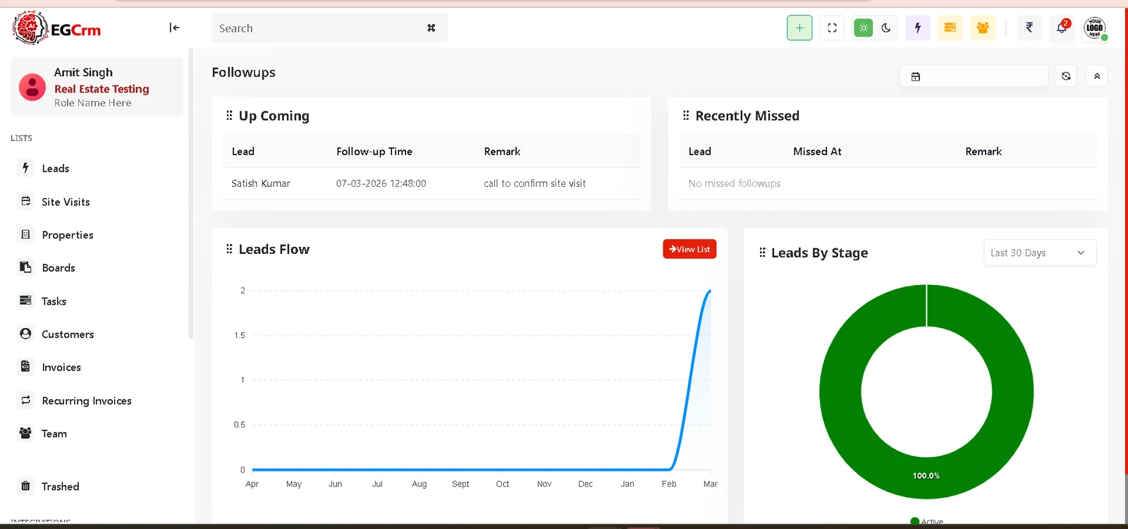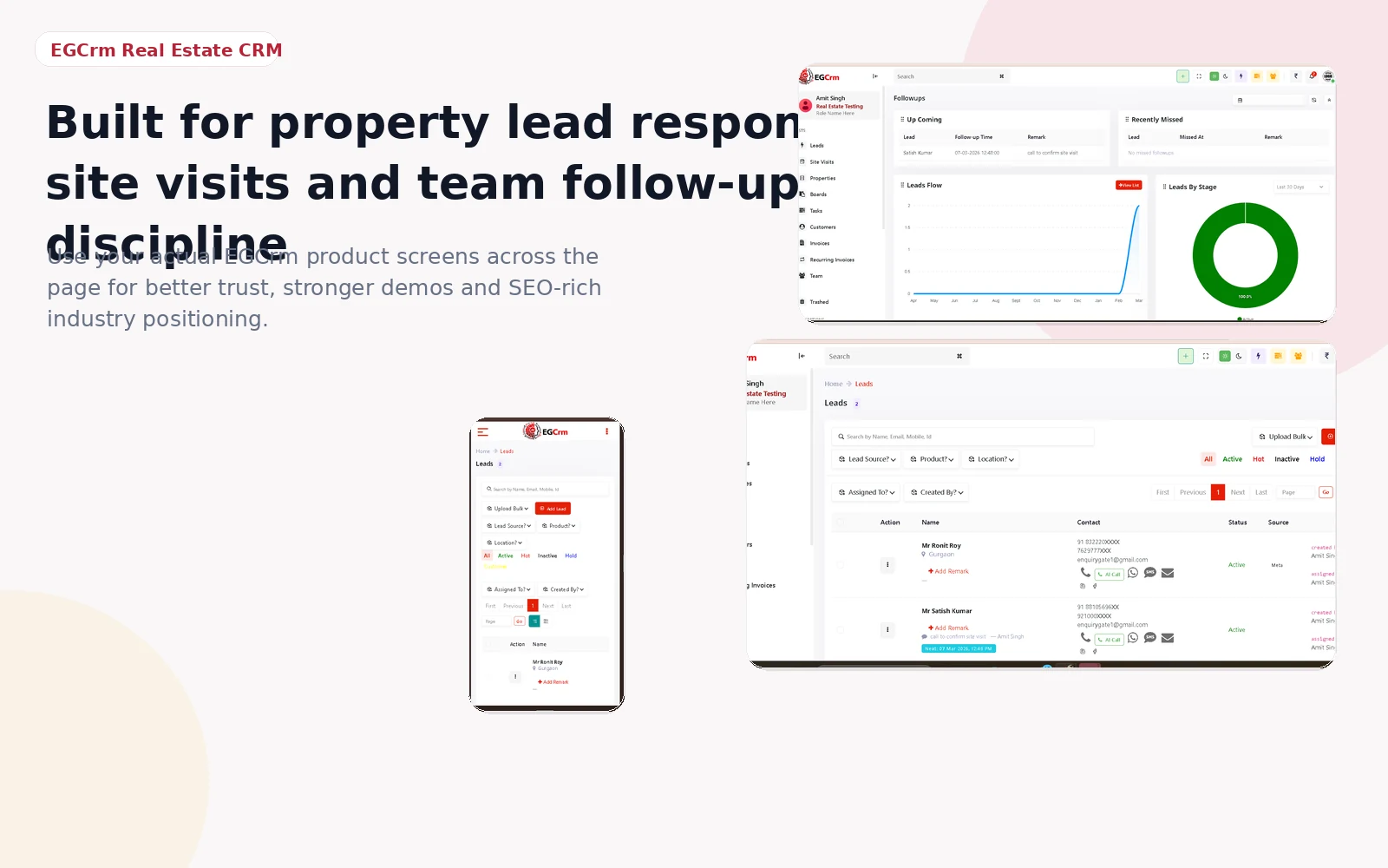EGCrm helps real estate teams capture Meta leads, manage website enquiries, automate WhatsApp and email follow-ups, schedule site visits, map leads to projects and properties, and track every enquiry from first contact to booking.